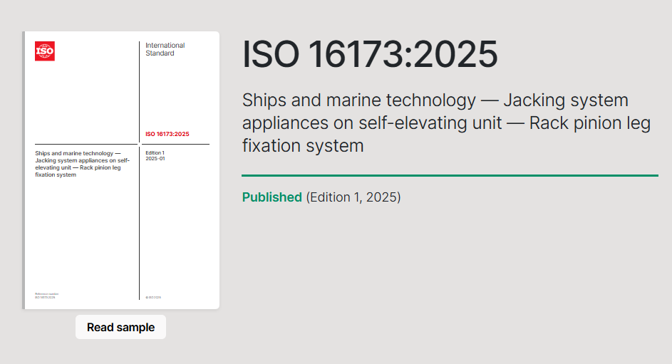 2025年1月,由廣東精銦海洋工程股份有限公司主導(dǎo)編制,聯(lián)合中國船舶工業(yè)綜合技術(shù)經(jīng)濟(jì)研究院、中國船級社和中山大學(xué)共同參與的ISO 16173:2025《船舶與海洋技術(shù)自升式海洋平臺升降系統(tǒng)齒條式樁腿鎖緊裝置》國際標(biāo)準(zhǔn)正式發(fā)布。